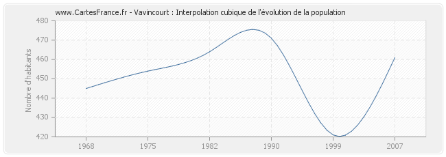 Cette courbe reprend l'historique de la population de Vavincourt de 1968 à 2007 en interpolation cubique. Ceci permet d'obtenir plus précisément la population de la commune de Vavincourt les années ou aucun recensement n'a été effectué.