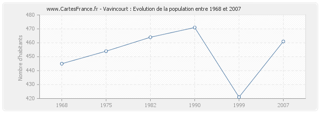 La population de Vavincourt était de 461 habitants en 2007, 421 habitants en 1999, 471 habitants en 1990, 464 habitants en 1982, 454 habitants en 1975 et 445 habitants en 1968.