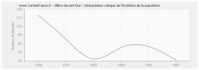 Cette courbe reprend l'historique de la population de Villers-devant-Dun de 1968 à 2007 en interpolation cubique. Ceci permet d'obtenir plus précisément la population de la commune de Villers-devant-Dun les années ou aucun recensement n'a été effectué.