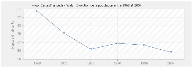 La population de Waly était de 57 habitants en 2007, 64 habitants en 1999, 66 habitants en 1990, 60 habitants en 1982, 76 habitants en 1975 et 98 habitants en 1968.