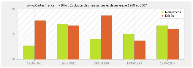 La population de Billio était de 355 habitants en 2007, 353 habitants en 1999, 366 habitants en 1990, 437 habitants en 1982, 441 habitants en 1975 et 457 habitants en 1968.
