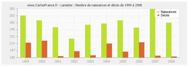 Lanester : évolution des naissances et décès de 1968 à 2007