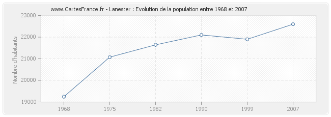 Cette courbe reprend l'historique de la population de Lanester de 1968 à 2007 en interpolation cubique. Ceci permet d'obtenir plus précisément la population de la commune de Lanester les années ou aucun recensement n'a été effectué.
