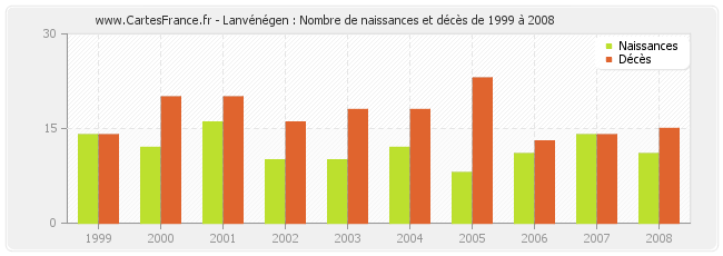 - Lanvénégen en 2008 : 11 naissances et 15 décès