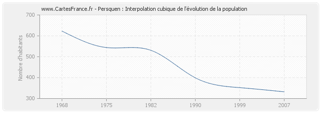 Cette courbe reprend l'historique de la population de Persquen de 1968 à 2007 en interpolation cubique. Ceci permet d'obtenir plus précisément la population de la commune de Persquen les années ou aucun recensement n'a été effectué.