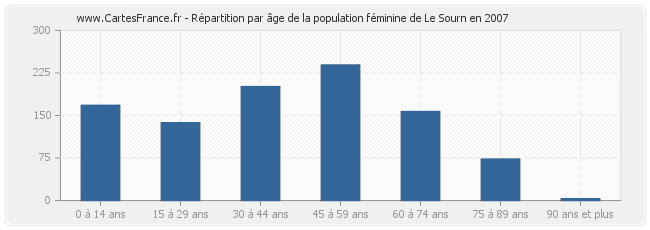 Répartition de la population féminine de Le Sourn par âge en 2007 :