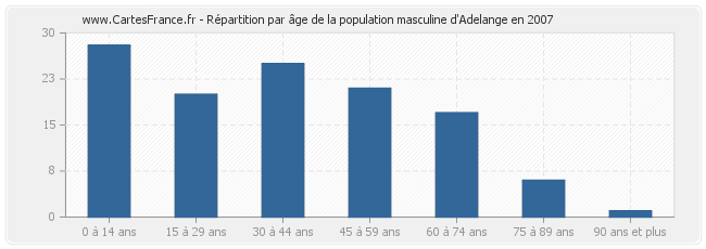 - Hommes de 0 à 14 ans habitant Adelange : 28