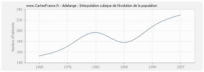 Cette courbe reprend l'historique de la population d'Adelange de 1968 à 2007 en interpolation cubique. Ceci permet d'obtenir plus précisément la population de la commune d'Adelange les années ou aucun recensement n'a été effectué.