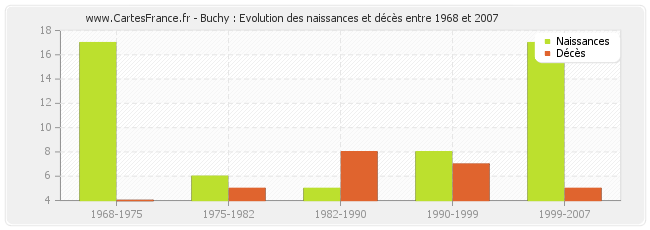 Buchy : évolution des naissances et décès de 1968 à 2007