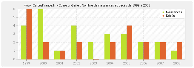 - Coin-sur-Seille en 2008 : 1 naissances et 2 décès