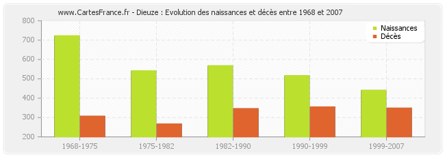 Dieuze : évolution des naissances et décès de 1968 à 2007