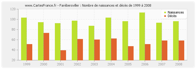 - Farébersviller en 2008 : 96 naissances et 58 décès