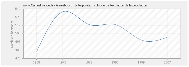 Cette courbe reprend l'historique de la population de Garrebourg de 1968 à 2007 en interpolation cubique. Ceci permet d'obtenir plus précisément la population de la commune de Garrebourg les années ou aucun recensement n'a été effectué.