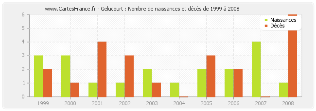 - Gelucourt en 2008 : 1 naissances et 6 décès