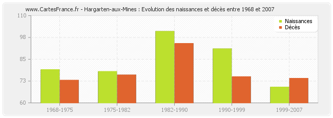 Hargarten-aux-Mines : évolution des naissances et décès de 1968 à 2007