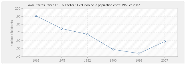 La population de Loutzviller était de 159 habitants en 2007, 144 habitants en 1999, 149 habitants en 1990, 168 habitants en 1982, 175 habitants en 1975 et 191 habitants en 1968.