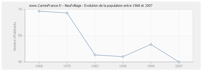 La population de Neufvillage était de 40 habitants en 2007, 50 habitants en 1999, 43 habitants en 1990, 44 habitants en 1982, 68 habitants en 1975 et 69 habitants en 1968.