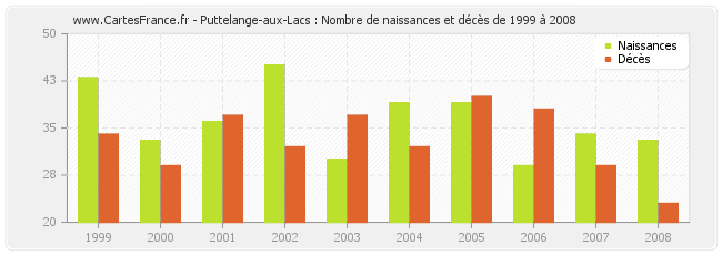 - Puttelange-aux-Lacs en 2008 : 33 naissances et 23 décès