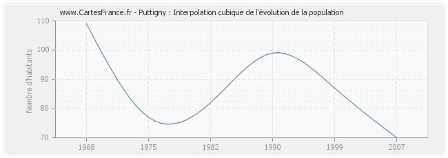 Cette courbe reprend l'historique de la population de Puttigny de 1968 à 2007 en interpolation cubique. Ceci permet d'obtenir plus précisément la population de la commune de Puttigny les années ou aucun recensement n'a été effectué.