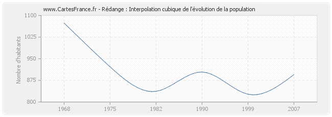 Cette courbe reprend l'historique de la population de Rédange de 1968 à 2007 en interpolation cubique. Ceci permet d'obtenir plus précisément la population de la commune de Rédange les années ou aucun recensement n'a été effectué.
