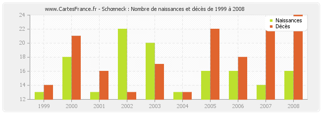 - Schœneck en 2008 : 16 naissances et 24 décès