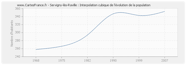 Cette courbe reprend l'historique de la population de Servigny-lès-Raville de 1968 à 2007 en interpolation cubique. Ceci permet d'obtenir plus précisément la population de la commune de Servigny-lès-Raville les années ou aucun recensement n'a été effectué.