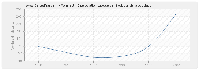 Cette courbe reprend l'historique de la population de Voimhaut de 1968 à 2007 en interpolation cubique. Ceci permet d'obtenir plus précisément la population de la commune de Voimhaut les années ou aucun recensement n'a été effectué.