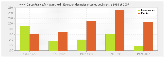Walscheid : évolution des naissances et décès de 1968 à 2007