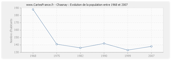 La population de Chasnay était de 138 habitants en 2007, 133 habitants en 1999, 142 habitants en 1990, 136 habitants en 1982, 141 habitants en 1975 et 188 habitants en 1968.