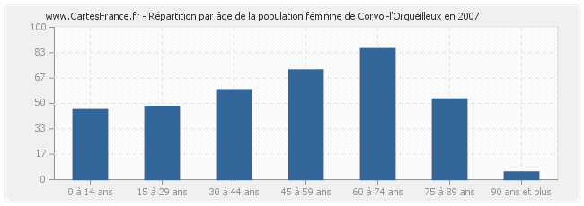 Répartition de la population féminine de Corvol-l'Orgueilleux par âge en 2007 :