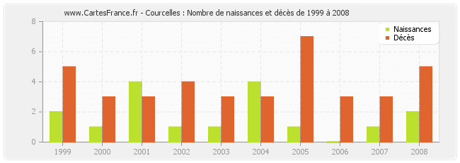 - Courcelles en 2008 : 2 naissances et 5 décès