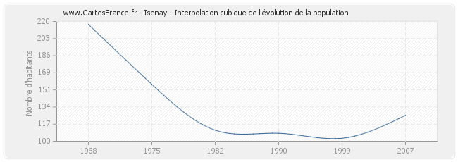 Cette courbe reprend l'historique de la population d'Isenay de 1968 à 2007 en interpolation cubique. Ceci permet d'obtenir plus précisément la population de la commune d'Isenay les années ou aucun recensement n'a été effectué.