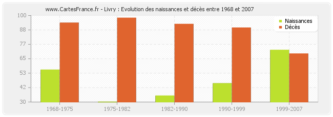 La population de Livry était de 684 habitants en 2007, 580 habitants en 1999, 589 habitants en 1990, 583 habitants en 1982, 735 habitants en 1975 et 772 habitants en 1968.