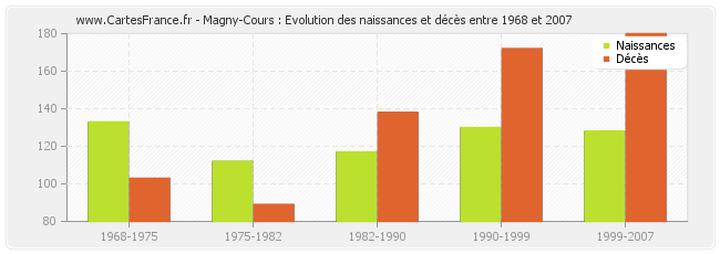 Magny-Cours : évolution des naissances et décès de 1968 à 2007