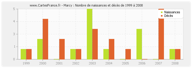 Marcy : évolution des naissances et décès de 1968 à 2007