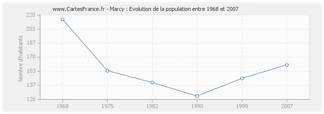 La population de Marcy était de 161 habitants en 2007, 145 habitants en 1999, 124 habitants en 1990, 140 habitants en 1982, 154 habitants en 1975 et 215 habitants en 1968.