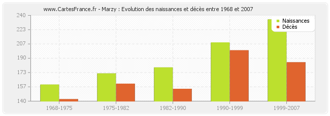 Marzy : évolution des naissances et décès de 1968 à 2007