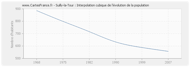 Cette courbe reprend l'historique de la population de Suilly-la-Tour de 1968 à 2007 en interpolation cubique. Ceci permet d'obtenir plus précisément la population de la commune de Suilly-la-Tour les années ou aucun recensement n'a été effectué.