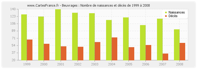 - Beuvrages en 2008 : 92 naissances et 60 décès