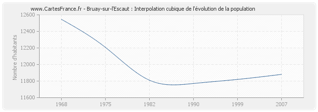 Cette courbe reprend l'historique de la population de Bruay-sur-l'Escaut de 1968 à 2007 en interpolation cubique. Ceci permet d'obtenir plus précisément la population de la commune de Bruay-sur-l'Escaut les années ou aucun recensement n'a été effectué.