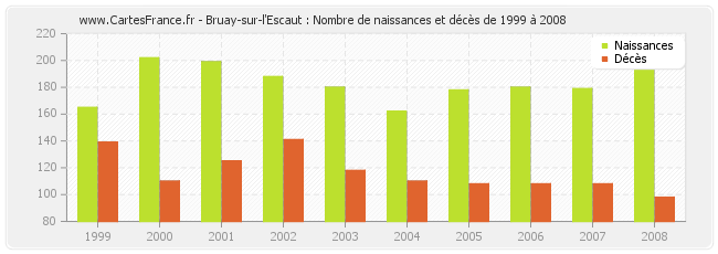 - Bruay-sur-l'Escaut en 2008 : 207 naissances et 98 décès