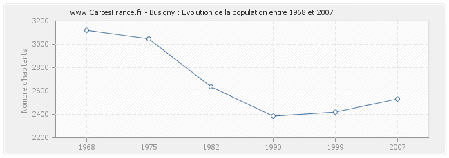 La population de Busigny était de 2 532 habitants en 2007, 2 420 habitants en 1999, 2 385 habitants en 1990, 2 636 habitants en 1982, 3 046 habitants en 1975 et 3 120 habitants en 1968.