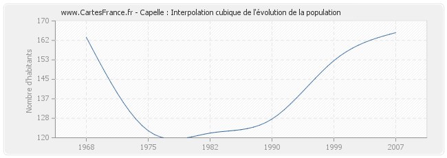 Cette courbe reprend l'historique de la population de Capelle de 1968 à 2007 en interpolation cubique. Ceci permet d'obtenir plus précisément la population de la commune de Capelle les années ou aucun recensement n'a été effectué.