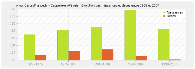 Cappelle-en-Pévèle : évolution des naissances et décès de 1968 à 2007