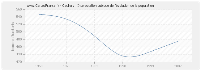 Cette courbe reprend l'historique de la population de Caullery de 1968 à 2007 en interpolation cubique. Ceci permet d'obtenir plus précisément la population de la commune de Caullery les années ou aucun recensement n'a été effectué.