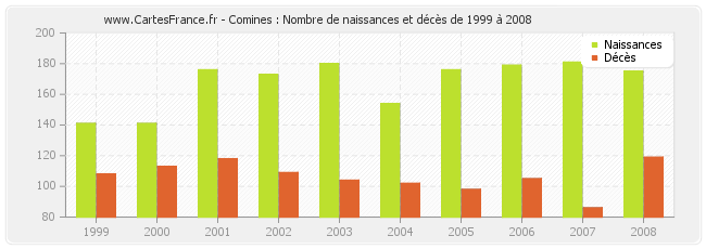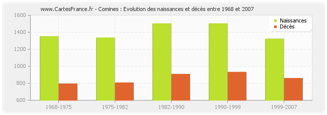 La population de Comines était de 12 208 habitants en 2007, 11 945 habitants en 1999, 11 320 habitants en 1990, 10 915 habitants en 1982, 10 485 habitants en 1975 et 10 128 habitants en 1968.