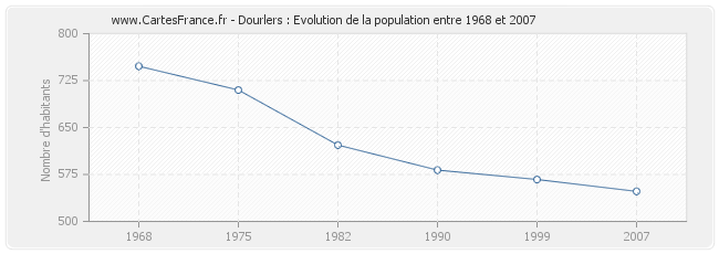La population de Dourlers était de 548 habitants en 2007, 567 habitants en 1999, 582 habitants en 1990, 622 habitants en 1982, 710 habitants en 1975 et 748 habitants en 1968.
