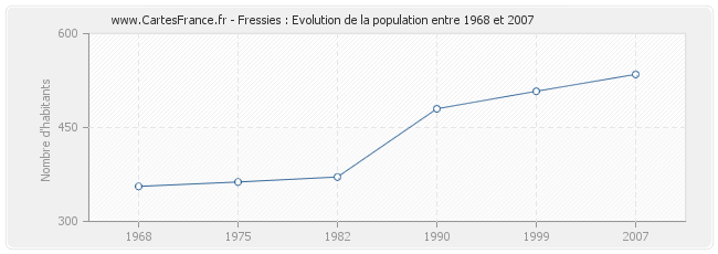 La population de Fressies était de 535 habitants en 2007, 508 habitants en 1999, 480 habitants en 1990, 371 habitants en 1982, 363 habitants en 1975 et 356 habitants en 1968.