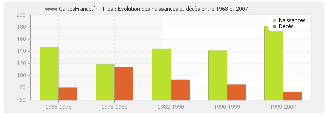 Cette courbe reprend l'historique de la population d'Illies de 1968 à 2007 en interpolation cubique. Ceci permet d'obtenir plus précisément la population de la commune d'Illies les années ou aucun recensement n'a été effectué.