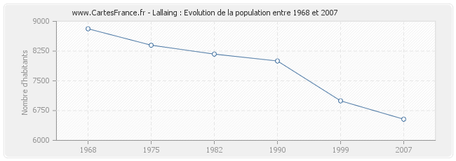 La population de Lallaing était de 6 533 habitants en 2007, 6 996 habitants en 1999, 8 001 habitants en 1990, 8 174 habitants en 1982, 8 399 habitants en 1975 et 8 813 habitants en 1968.
